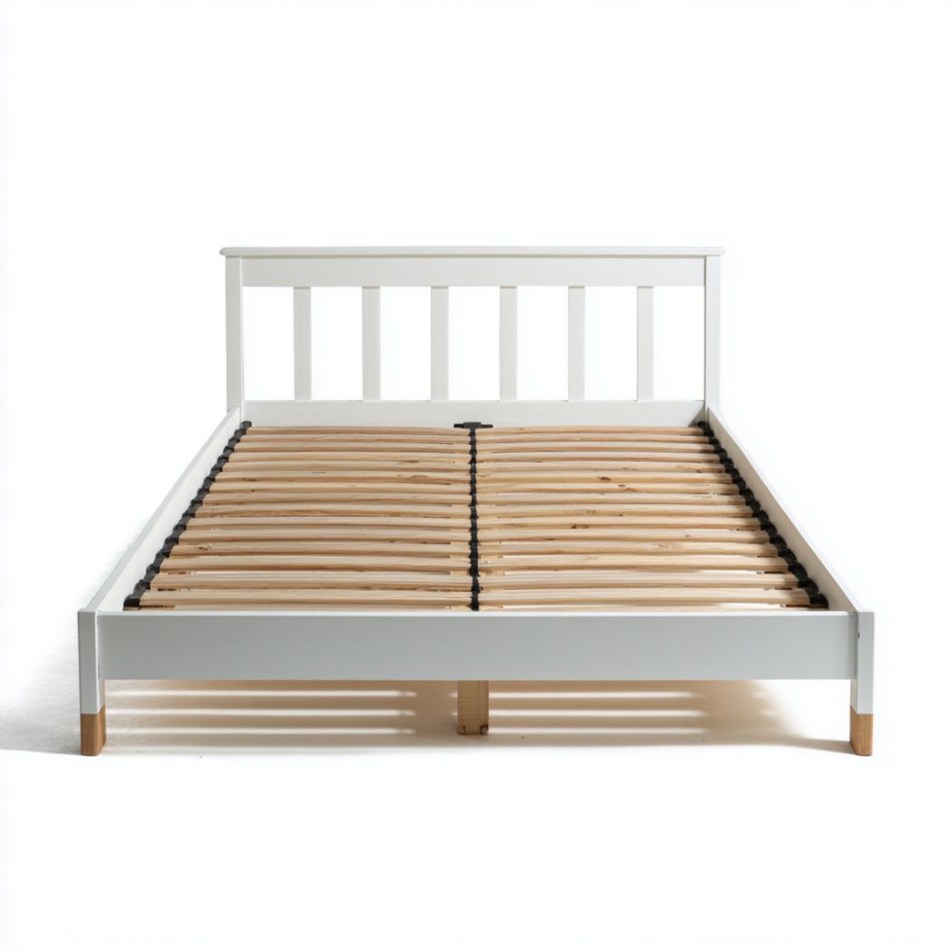 • Lit double en bois blanc avec tête de lit à lattes et sommier à lattes