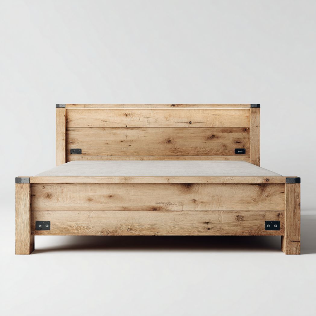 • Lit double en bois massif finition chêne rustique avec détails métalliques